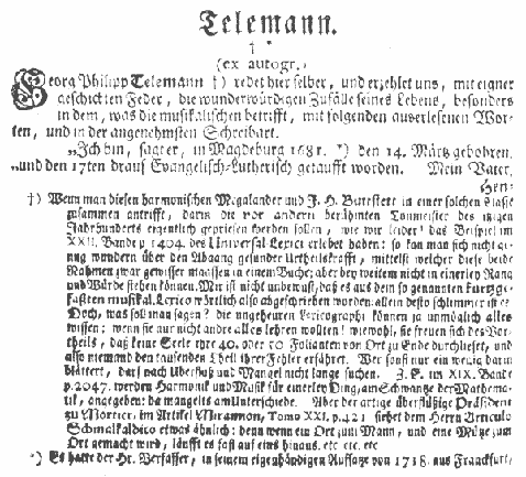 Georg Philipp Telemann+) redet hier selber, und erzehlet uns, mit eigner geschickten Feder, die wunderwürdigen Zufälle seines Lebens, besonders in dem, was die musikalischen betrifft, mit folgenden auserlesenen Worten, und in der angenehmsten Schreibart.