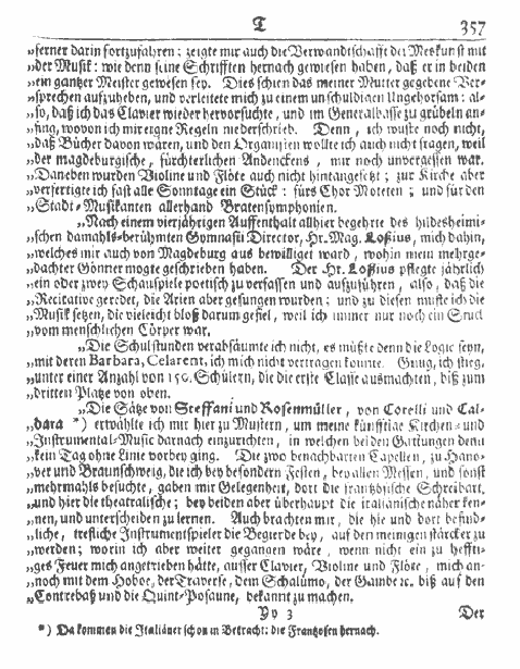 Die Schulstunden verabsäumte ich nicht, es müßte denn die Logic seyn, mit deren Barbara, Celarent, ich mich nicht vertragen konnte. Gnug, ich stieg, unter einer Anzahl von 150. Schülern, die die erste Classe ausmachten, biß zum dritten Platz von oben. Die Sätze vonSteffani und Rosenmüller, von Corelli und Caldara*) erwählte ich mir hier zu Mustern, um meine künfftige Kirchen- und Instrumental-Music darnach einzurichten, in welchen beiden Gattungen denn kein Tag ohne Linie vorbey ging. Die zwo benachbarten Capellen, zu Hanover und Braunschweig, die ich bey besondern Festen, bey allen Messen, und sonst mehrmals besuchte, gaben mir Gelegenheit, dort die frantzösische Schreibart, und hier die theatralische; bey beiden aber überhaupt die italiänische näher zu kennen, und unterscheiden zu lernen. Auch brachten mir, die hie und dort befindliche, treffliche Instrumentalspieler die Begierde bey, auf den meinigen stärcker zu werden; worin ich aber weiter gegangen wäre, wenn nicht ein zu hefftiges Feuer mich angetrieben hätte, ausser Clavier, Violine und Flöte mich annoch mit dem Hoboe, der Traverse, dem Schalümo, der Gambe etc. biß auf den Contrebaß und die Quint-Posaune, bekannt zu machen.